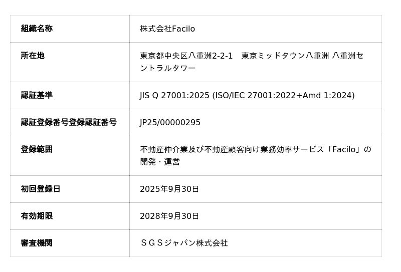 ファシロは「住みかえを軽やかに、人生を鮮やかに。」をビジョンに、不動産仲介の情報・コミュニケーションをクラウドで一元化・可視化する不動産コミュニケーションクラウド『Facilo』 を提供しています。プロダクト拡充や拠点拡大に伴い、個人情報・取引情報・物件情報等の機密性・完全性・可用性を高い水準で守ることは、お客さまに安心してご利用いただくための重要基盤であると考えており、このたびISMS認証を取得しました。ISMS認証の取得は、ファシロが進めてきた安全な運用体制の継続的改善を、国際規格準拠の仕組みとして可視化・強化する取り組みです。