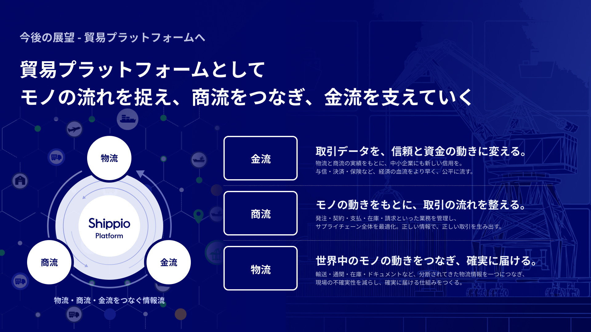 貿易DXを推進する株式会社Shippio(本社:東京都港区、代表取締役:佐藤 孝徳、以下「Shippio」)は、このたびシリーズCラウンドにて、DNX Venturesをリード投資家とし、新たに鈴与株式会社、New Commerce Ventures株式会社等を引受先とした18.7億円のエクイティファイナンス、および金融機関からのデットファイナンス13.7億円を合わせ、総額32.4億円の資金調達を実施しました。これにより累計調達額は約70億円となります。調達資金は、プロダクト開発、M&Aを含む事業拡大、組織づくりに充当し「国際物流を、アドバンストに」のビジョン実現に向け、貿易DXをさらに加速させてまいります。