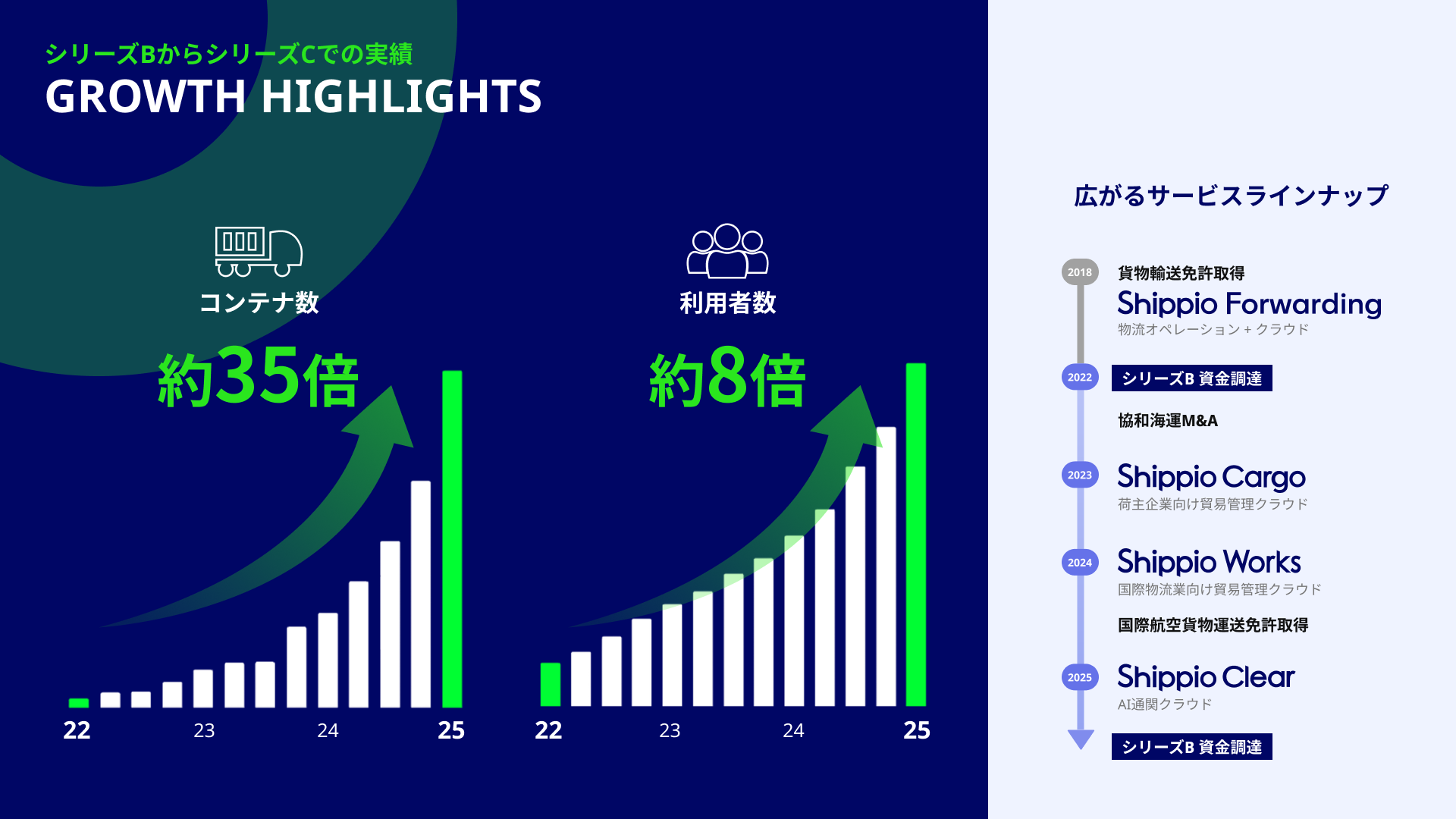 2022年のシリーズB資金調達以降、貿易プラットフォーム「Shippio Platform」を構成する3つのDXサービスを拡充し、メーカー・商社等の荷主企業及び国際物流事業者の市場を開拓してまいりました。2022年以降の3年でネットレベニュー(売上総利益):約20倍、取扱コンテナ数:約35倍、プラットフォームのユーザー数:約8倍に伸長しています。