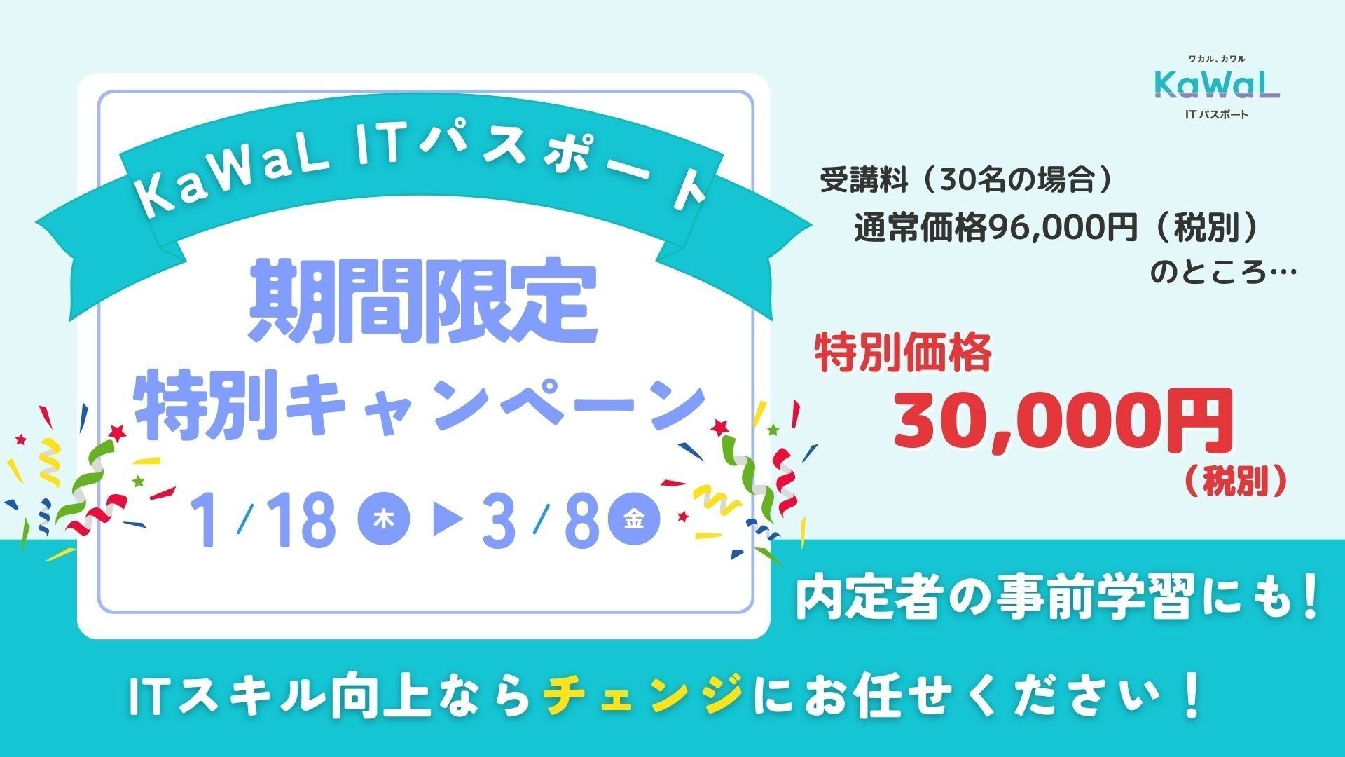 あらゆる企業や団体に「KaWaL ITパスポート」をご活用いただきたく、2024年3月8日までにお申し込みの方限定でキャンペーンを実施しています。この機会にぜひお試しください。