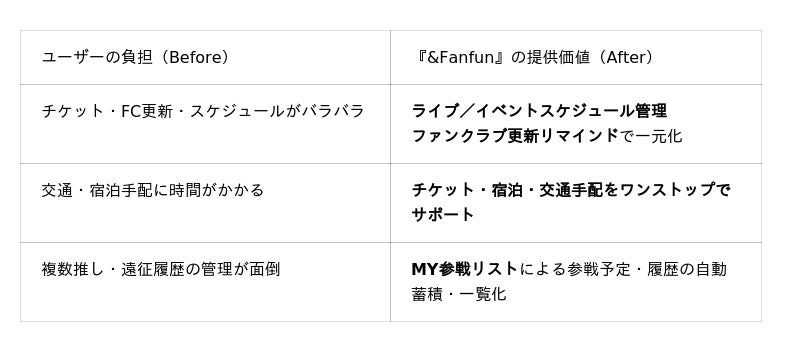 『&Fanfun』は、「遠征で必要なタスク管理がアプリ1つでできる!推し活をもっと楽しく快適に」をコンセプトに、以下の機能を通じてこの課題を解決し、利用を拡大してきました。