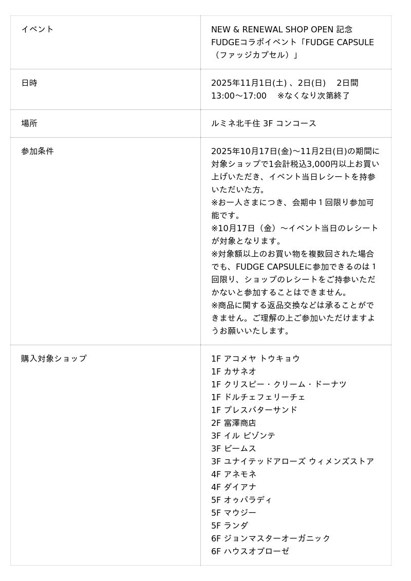 この秋、ルミネ北千住とFUDGEがコラボレーションし、ニュー&リニューアルオープンする17のショップを盛り上げるキャンペーン「NEW & RENEWAL SHOP OPEN ますます楽しい、北千住」を開催!その一環として、16ショップを対象とした特別イベント「FUDGE CAPSULE(ファッジカプセル)」を実施します。