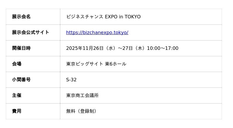 株式会社川村インターナショナル(本社:東京都新宿区、代表取締役:森口 功造)は、2025年11月26日(水)~27日(木)に開催される「ビジネスチャンス EXPO in TOKYO」に出展いたします。