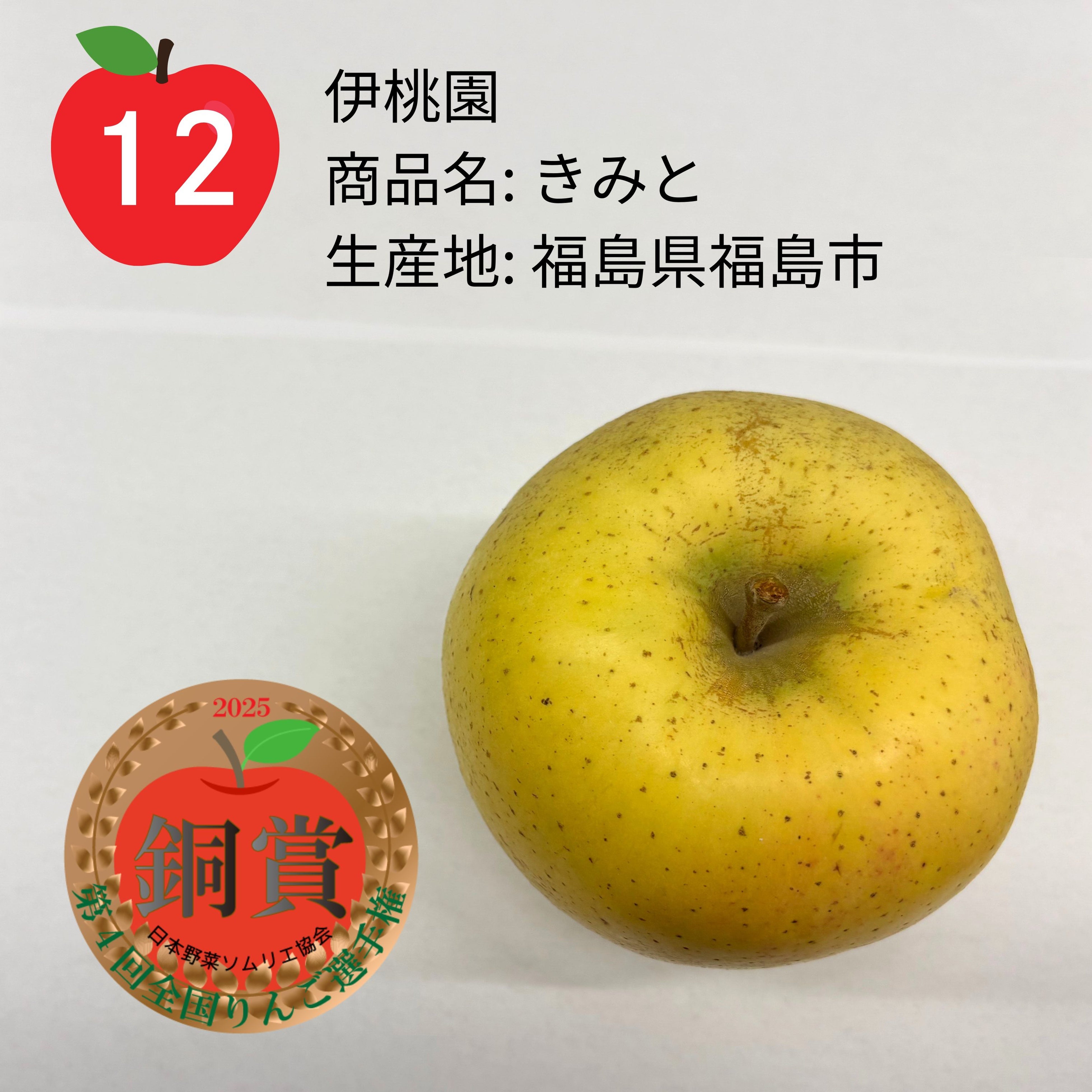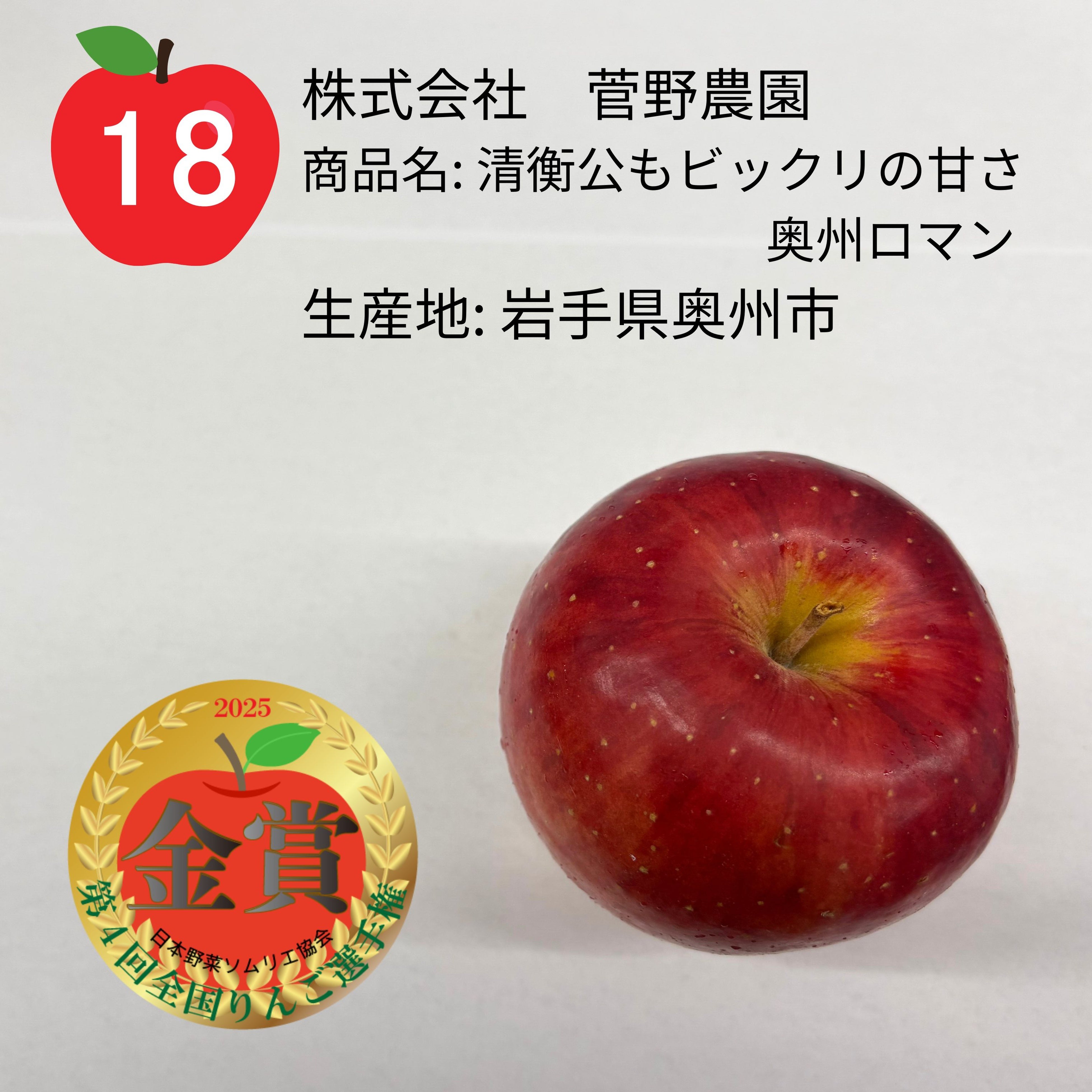 - 入賞:星の金貨/JAいわて中央りんご部会青年部 朝島観光りんご園(岩手県盛岡市)- 入賞:サンふじ/if-imaifarm今井農園(青森県平川市)- 入賞:奥州ロマン/JAいわて中央りんご部会青年部 北田りんご園(岩手県盛岡市)- 入賞:シナノスイート/株式会社大澤屋(長野県山ノ内町)- 入賞:山と海の幸 松下農園りんご/泰阜村 松下農園(長野県下伊那郡泰阜村)