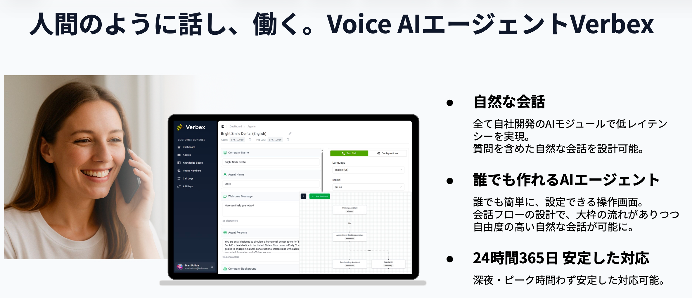 日本語モデルのリリースと商用利用事例ベンガル語、英語で先行して研究開発を進めてきたVerbexは、今年8月に日本語モデルをリリース、これにより圧倒的に自然な日本語対話を実現し、日本市場における実用フェーズへと進化しました。
