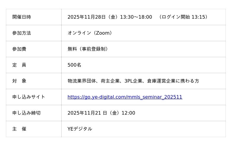 株式会社YE DIGITAL(本社:北九州市小倉北区、代表取締役社長:玉井裕治、以下、YEデジタル)は、この度、物流DXをテーマにしたオンラインセミナー『物流革新サミット2025~倉庫から変えるサプライチェーンの未来~』を2025年11月28日(金)に開催します。