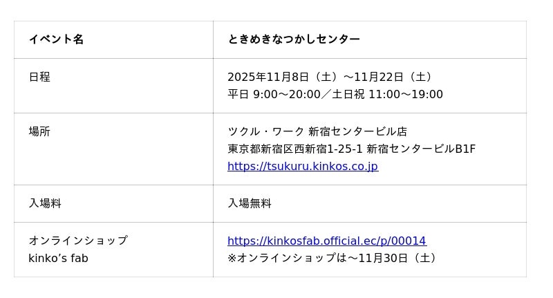 キンコーズ・ジャパン株式会社(本社:東京都港区、代表取締役社長:渡辺 浩基、以下 キンコーズ)は、2025年11月8日(土)より、キンコーズが運営するコワーキングスペース「ツクル・ワーク 新宿センタービル店」(以下、ツクル・ワーク)にて、イラストレーター・中村 杏子(なかむら きょうこ)とのコラボレーション展示『ときめきなつかしセンター』を開催します。