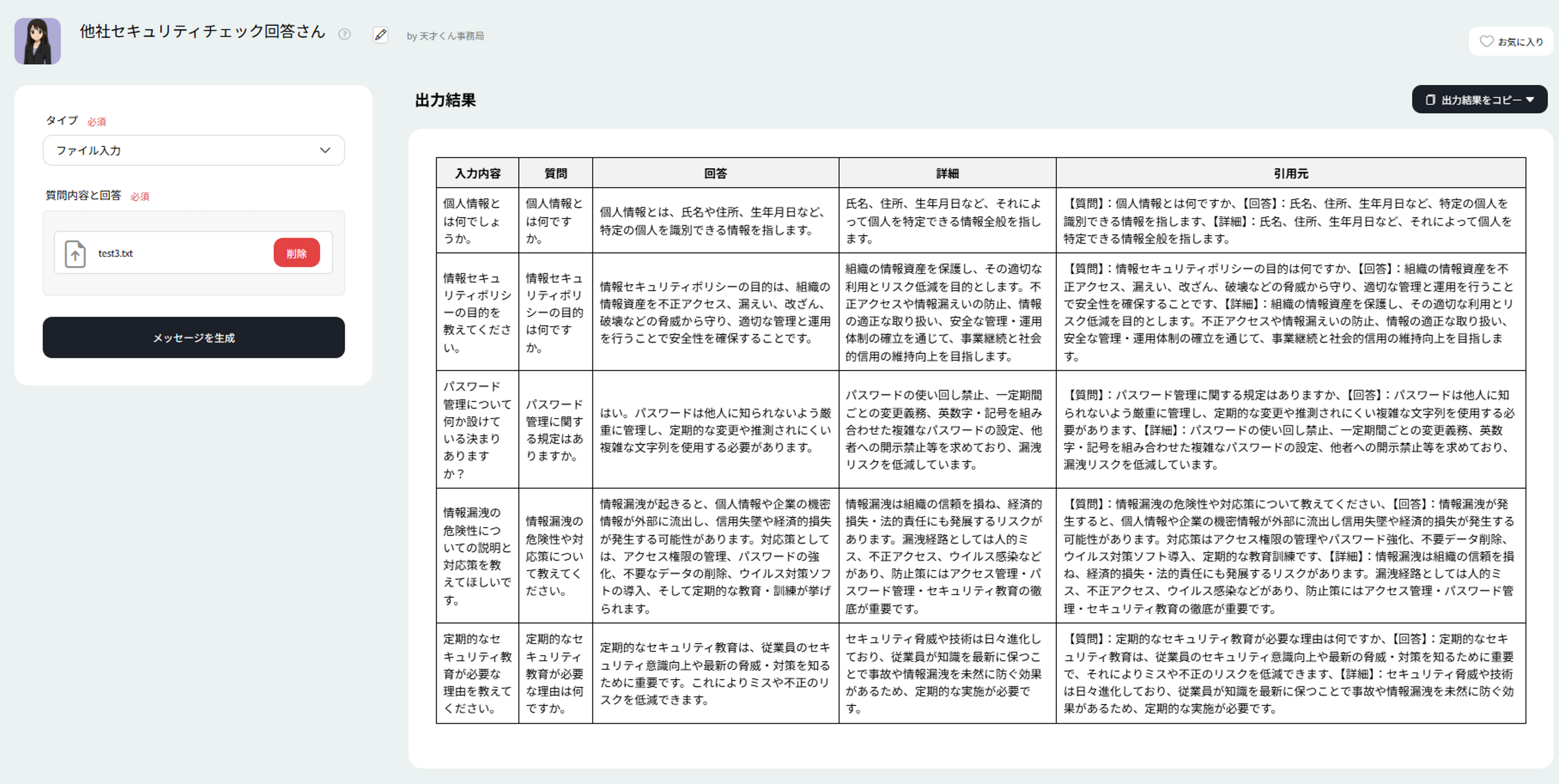 「天才くんfor情シス」の情シス業務特化型テンプレート【他社セキュリティチェック回答さん】の生成イメージ
