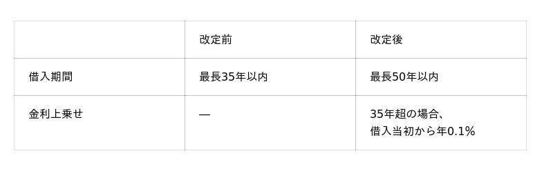 - 住宅ローンの借入期間を最長50年まで延長することで、月々の返済負担を軽減できます。たとえば、5,000万円を変動金利(半年型)年0.68%で借り入れ、返済期間を35年とした場合、毎月の返済額は約13.3万円となります。これを50年返済に変更すると、金利は年0.1%上乗せされて年0.78%となりますが、毎月の返済額は約10万円となり、35年返済と比べて月々約3.3万円、年間では約39.6万円の返済負担を軽減できます。- 返済額が抑えられることで、借入可能額の増額を検討しやすくなり、購入可能な住宅物件の選択肢が広がります。たとえば、金利年0.68%で毎月の返済額を13万円程度に抑えたい場合、35年返済では借入可能額は約4,900万円ですが、50年返済にすると同じ返済額で約6,500万円まで借り入れが可能となり、より広い物件や立地条件の良い住宅も選択肢に入ってきます。
