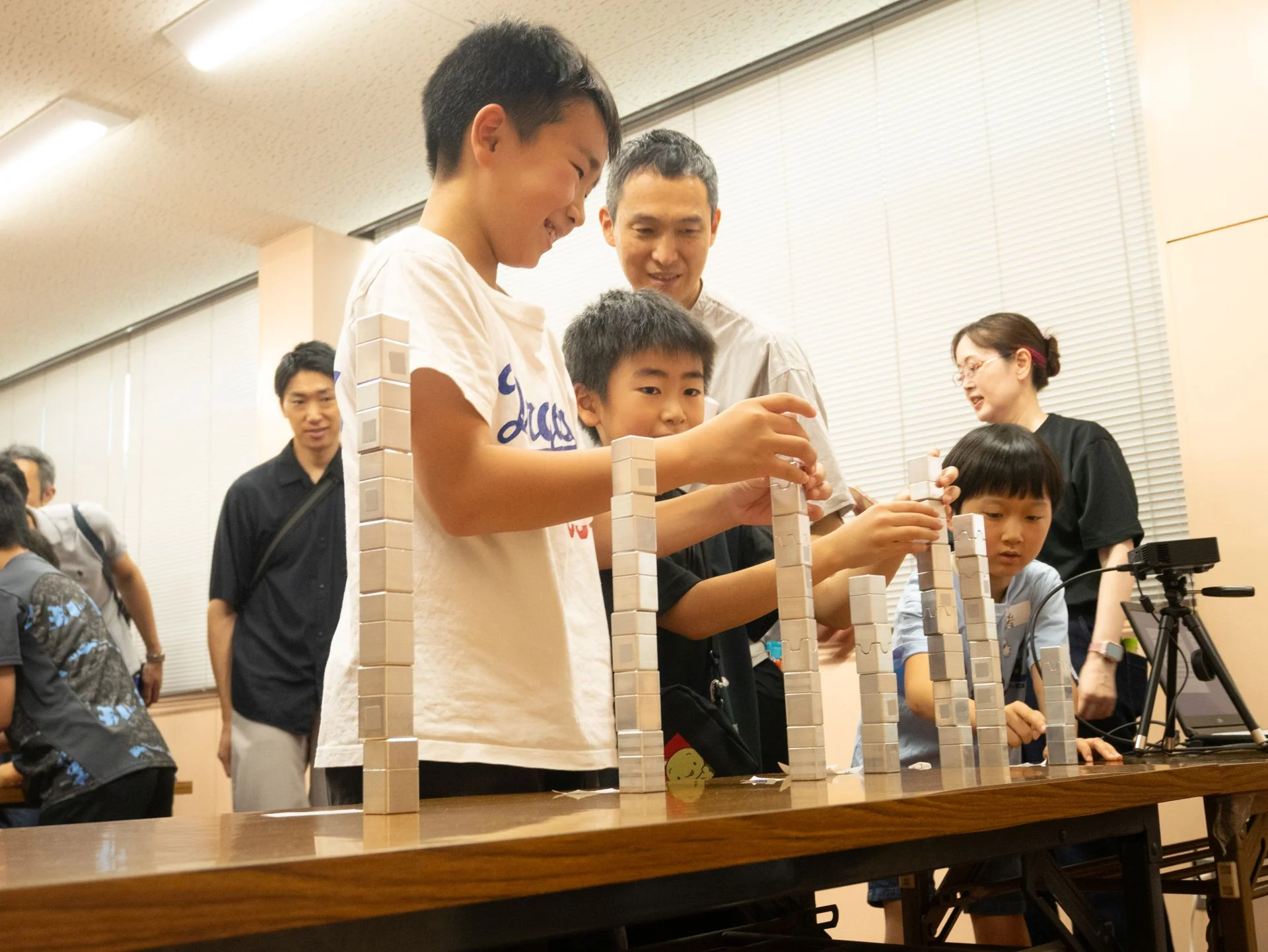 ■ “ブロックゲーム”で体感する付加価値とコスト続いてのブロック積みゲームでは、金型設計の概念をゲーム化。形状によって“加工コスト=点数”が変わる仕組みで、親子が戦略を練りながらブロックを積み上げました。子どもたちは「難しい形を選んだ方が高得点」「加工の大変さが分かった」といった学びの声が上がりました。