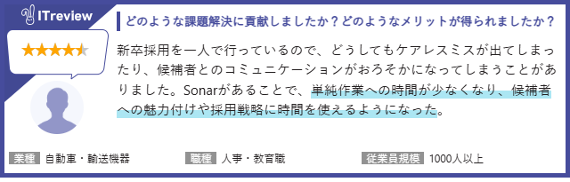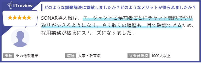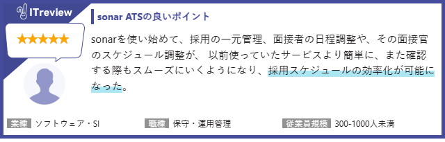 採用管理システム「sonar ATS」は、採用業務のデジタル化により、各種オペレーションの自動化やデータ分析による業務効率化を実現するサービスです。2025年10月時点で100件以上のレビューを頂いており、ユーザーの皆さまからは以下のようなレビューをいただいています。