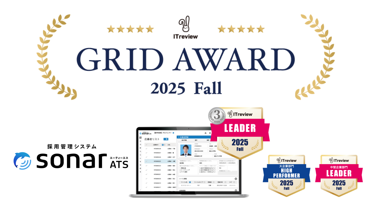 https://hr.sonar-ats.jp/1030_ITreview_fall)」は、 アイティクラウド株式会社(東京都港区、代表取締役社長 兼 CEO:黒野 源太)主催の「ITreview Grid Award 2025 Fall」において、採用管理システム(ATS)部門で3年連続「Leader」を受賞しました。また、大企業部門では「High Performer」、中堅企業部門では「Leader」にも選出されています。