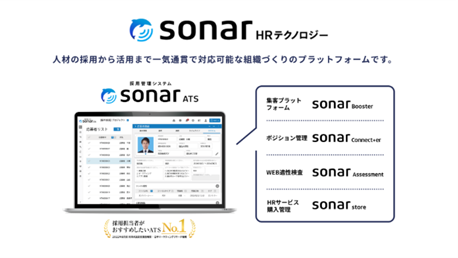 「sonar HRテクノロジー」は、人材の採用から活躍まで一気通貫で対応可能な組織づくりのプラットフォームです。その中心となる採用管理システム「sonar ATS」は、採用業務のデジタル化を通じて、各種オペレーションの自動化や、データ分析による効率化を実現。採用担当者の業務負荷を大幅に削減します。2012年よりサービス提供を開始し、株式会社NTTデータグループ、全日本空輸株式会社、ダイキン工業株式会社、トヨタ自動車株式会社、法務省、文部科学省、LINEヤフー株式会社など、累計2,300社を超える企業や官公庁に利用されています。
