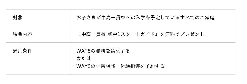 お問い合わせ、または資料請求をされた方全員に、WAYS限定コンテンツ『中高一貫校 新中1スタートガイド』を無料でプレゼントいたします。まずはお気軽に資料をご請求ください!
