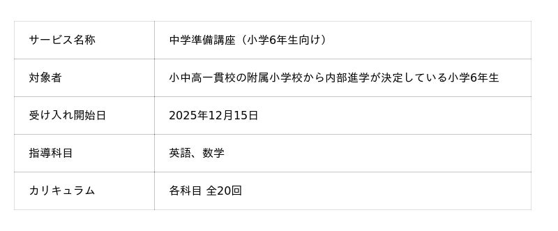 中高一貫校専門 個別指導塾WAYS(運営:株式会社メイツ、本社:東京都新宿区)は、附属小学校からの内部進学が決定している小学6年生を対象とした新コース「中学準備講座」を新設し、2025年12月15日(月)より受け入れを開始します。