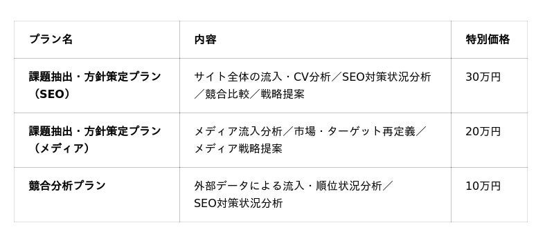 年末限定の「SEOセカンドオピニオン特別プラン」では、課題抽出から戦略提案までをワンストップで提供します。