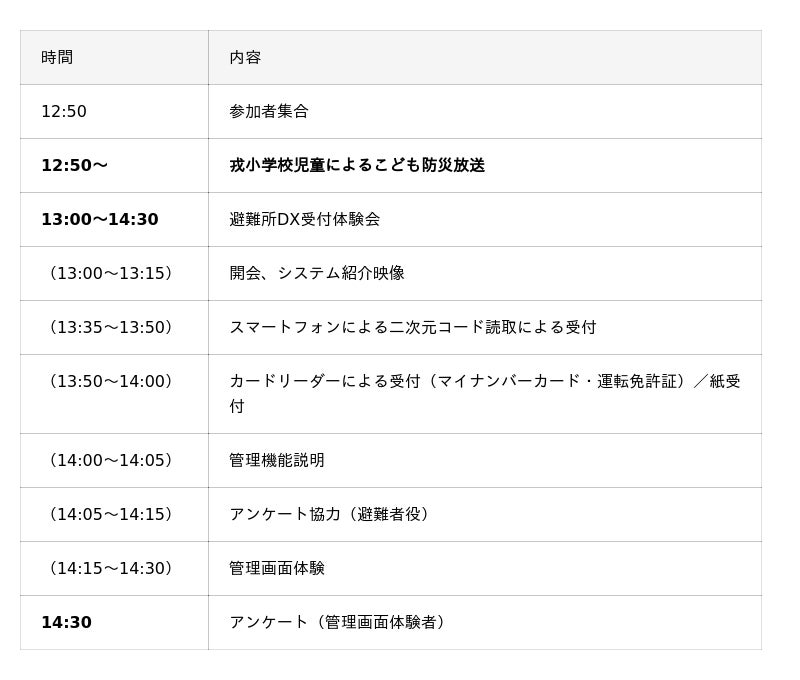 - バカン 避難者マネジメントシステムを活用した避難所入所受付- カードリーダーによる受付(マイナンバーカードまたは運転免許証)- スマートフォンによる二次元コード読取による受付- 紙の避難者カードによる従来方式との比較- 受付から名簿作成・避難者管理までの業務効率検証- 管理画面を用いたリアルタイム情報共有のデモンストレーション