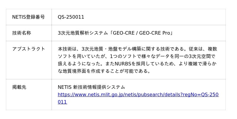 応用地質株式会社 (本社:東京都千代田区、代表取締役社長:天野 洋文、以下、当社) は、3次元地質解析システム「GEO-CRE / GEO-CRE Pro」が国土交通省の新技術情報提供システム「NETIS」に登録されたことをお知らせいたします。