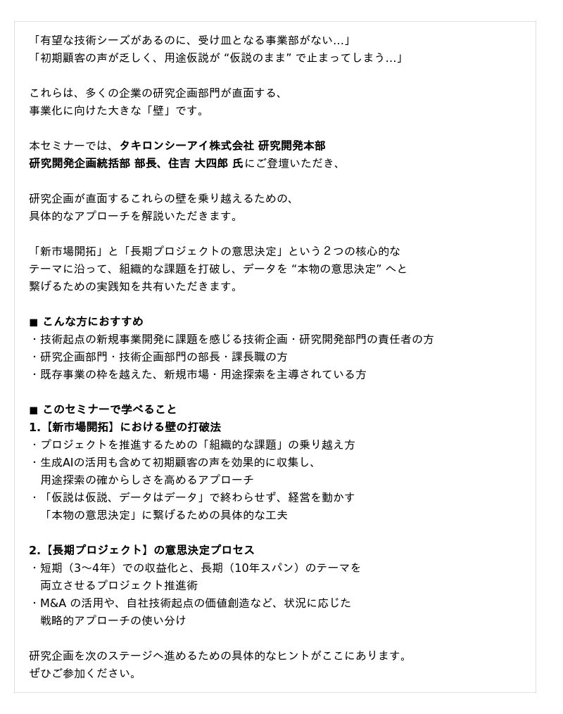 【 11/11 (火) 16:00 】研究企画の成否を分ける「市場探索」と「長期テーマ意思決定」 無料オンラインセミナーを開催