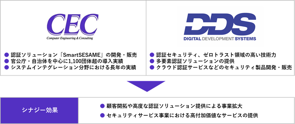 シーイーシーの「SmartSESAME」などの認証・セキュリティ製品群を、ディー・ディー・エスのセキュリティサービス事業で補完し、より高付加価値なサービスの提供を目指します。