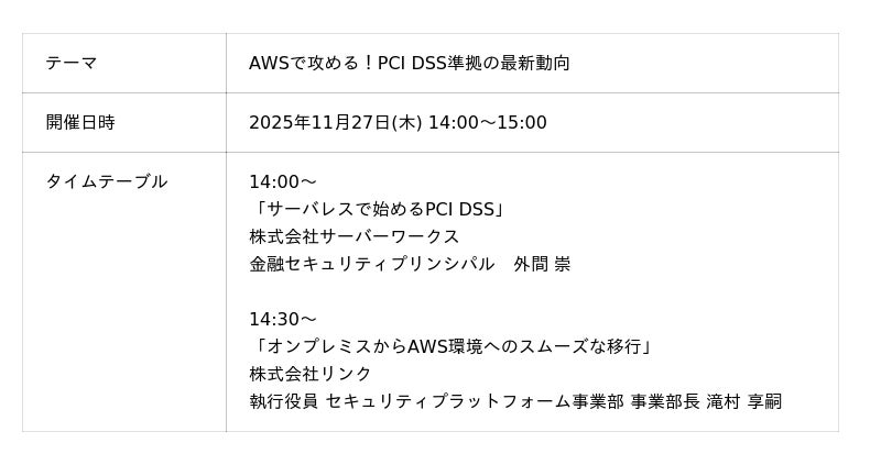 アマゾン ウェブ サービス(以下: AWS )の AWS プレミアティアサービスパートナーである株式会社サーバーワークス(本社:東京都新宿区、代表取締役社長:大石 良、以下:サーバーワークス)は、PCI DSS 準拠を進めるクラウドサービス 「PCI DSS Ready Cloud」を展開する株式会社リンク(本社:東京都港区、代表取締役社長:岡田元治、以下:リンク社)とクレジットカード・セキュリティ対策における業務提携を強化します。
