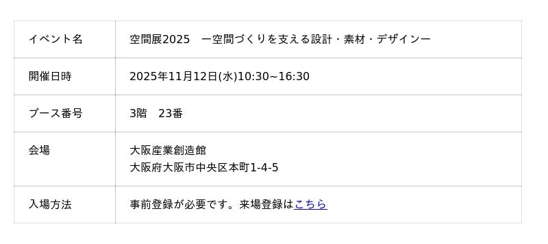 この度、11月12日(水)に開催される「空間展2025ー空間づくりを支える設計・素材・デザイン」に出展致します。ご来場の際は、是非シュンビンのブース(小間番号:3階-23番)へお立ち寄りください。