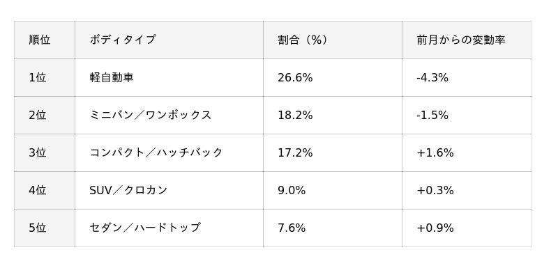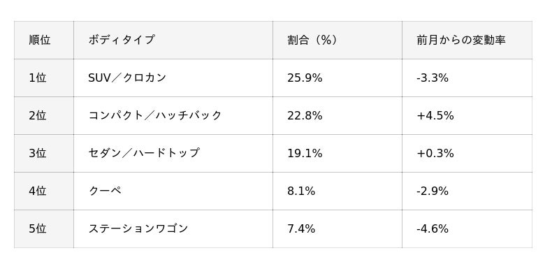 国産車ボディタイプ別買取ランキングは、1位の軽自動車から5位のセダン/ハードトップまで前月と同様の結果となりました。変動率では減少しているように見える1位の軽自動車と2位のミニバン/ワンボックスですが、全体の買取台数は増加しています。また、SUV/クロカンは多くのユーザーが乗り換え時期を迎えていることが、今回の結果にも表れています。