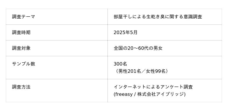 本調査では、部屋干しの頻度や不快感、対策方法などを幅広く調査し、臭いの原因と効果的な防止策を探りました。