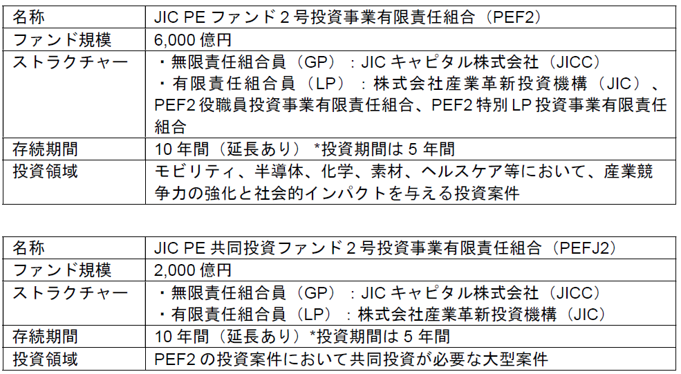 株式会社産業革新投資機構(本社:東京都港区、代表取締役社長CEO:横尾敬介、以下「JIC」)と、傘下のJICキャピタル株式会社(本社:東京都港区、代表取締役社長 CEO:池内省五、以下「JICC」)は、JICCを運用者とする、JIC PEファンド2号投資事業有限責任組合(ファンド規模:6,000億円、以下「PEF2」)を11月1日に組成します。併せて、大型案件に対してPEF2と共同投資を行うことを目的にJIC PE共同投資ファンド2号投資事業有限責任組合(ファンド規模:2,000億円、以下「PEFJ2」)を組成します。(以下、PEF2とPEFJ2を合わせて、「JIC PE2」という。)JIC PE2全体で8,000億円規模のファンドとなります。