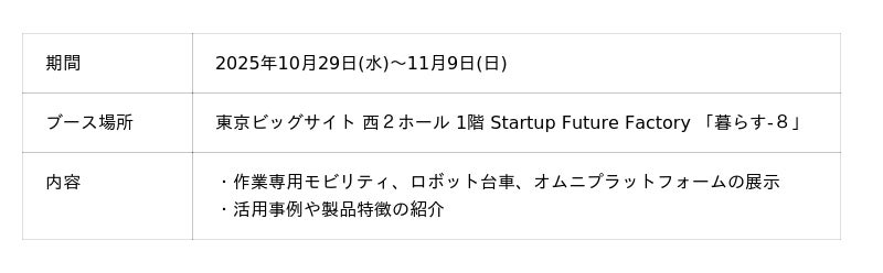 本事業は「with Mobility:モビリティとともに。拡がる体験、新たな仕組み。」の分野でJMSに出展しています。ブースでは、ロボット台車とオムニプラットフォームに加え、実際の活用事例として作業専用モビリティを展示するとともに、各種製品特徴などについて紹介しています。
