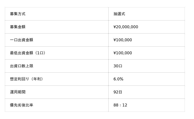 ※本ファンドは、元本保証商品ではありません。※本ページ中の数値等は、将来における運用成果等をお約束するものではありません。※賃料の滞納、滞納状態解消費用の発生、賃料単価の下落などにより、想定利回りを下回る可能性があります。※本ページは、信頼できる情報に基づき作成しておりますが、その正確性、完全性を保証するものではありません。