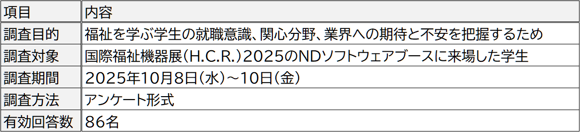 エヌ・デーソフトウェア株式会社(本社:山形県南陽市、代表取締役社長:松山 庸哉、以下「NDソフトウェア」)は、2025年10月8日(水)から10日(金)まで東京ビッグサイトで開催された「第52回 国際福祉機器展 H.C.R.2025」にて当社ブースに来場した学生を対象に、「福祉分野への就職に関する意識調査」を実施いたしました。