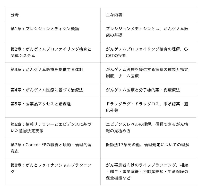 2級 Cancer FP(ACFP)の出題範囲には、3級(BCFP)で扱った基礎知識に加え、がんゲノム医療の領域や高度なFP知識・応用領域が含まれます。