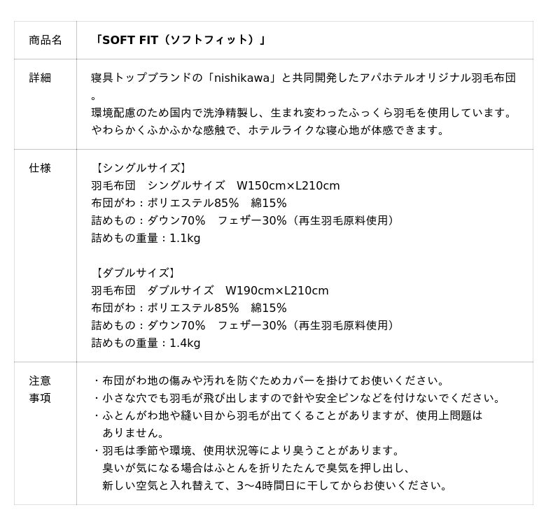 「nishikawa」と共同開発 アパホテルの羽毛布団「SOFT FIT」20%オフキャンペーンを開催