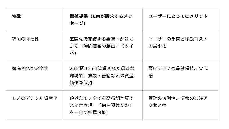 住空間に悩む層、タイパを重視する層、そしてデジタルネイティブな層に対し、「収納は手間をかけるものではなく、賢く外部にアウトソースするもの」という新しい価値観を提案し、サービスの利用を「コスト」ではなく「未来の生活への投資」として捉え直していただくことが戦略的な狙いです。