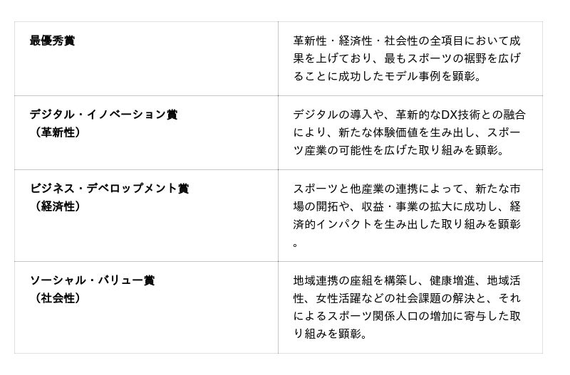本コンテストは、スポーツ産業の更なる成長・拡大と、新価値創造に向けた機運醸成を目的に、スポーツ×他産業による先進的な共創事例を全国から広く募り、「革新性」「経済性」「社会性」の3つの観点で顕彰します。スポーツを起点に、社会と産業を動かした取り組みを可視化・発信することで、先進事例の更なる発展・拡大と、スポーツ界における新たな価値創造のムーブメントを促進します。