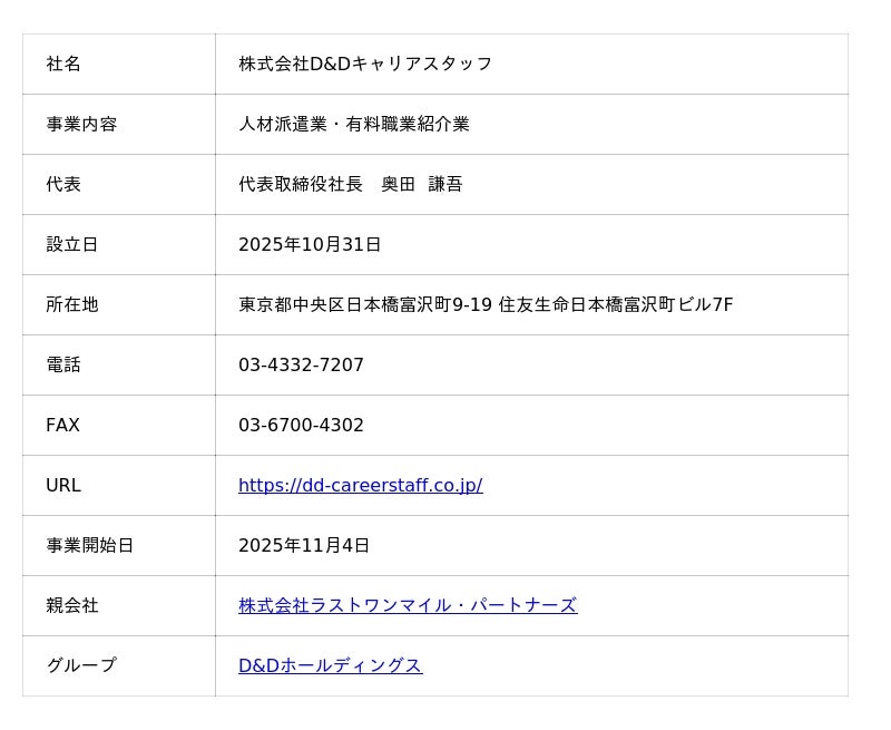 株式会社D&Dホールディングス(本社:東京都中央区、代表取締役社長:竹村 嘉規)のグループ会社である株式会社ラストワンマイル・パートナーズ(本社:東京都中央区、代表取締役社長:奥田 謙吾)は、これまで展開してきた人材派遣・人材紹介事業を分割し、2025年10月31日付で新会社「株式会社D&Dキャリアスタッフ」(本社:東京都中央区、代表取締役社長:奥田 謙吾)を設立いたしました。