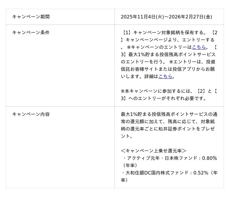 松井証券株式会社(本社:東京都千代田区、代表取締役 社長執行役員:和里田 聰、以下「当社」)は、2025年11月4日(火)より、三井住友DSアセットマネジメント社の「大和住銀DC国内株式ファンド」「アクティブ元年・日本株ファンド」を対象に、「最大1%貯まる投信残高ポイントサービス増量キャンペーン」を実施します。