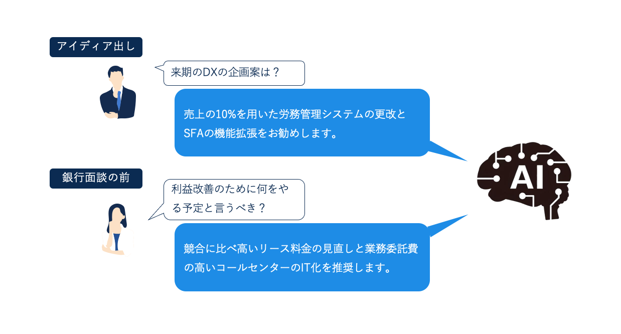 AIコンサルタントはアイディア出しなどにご利用頂けます。来期にやるべき施策案を出したり、銀行面談の前にやれる改善策を列挙してくれてり、簡単な相談相手としてお使いください。