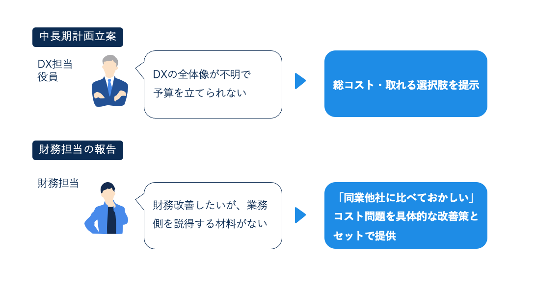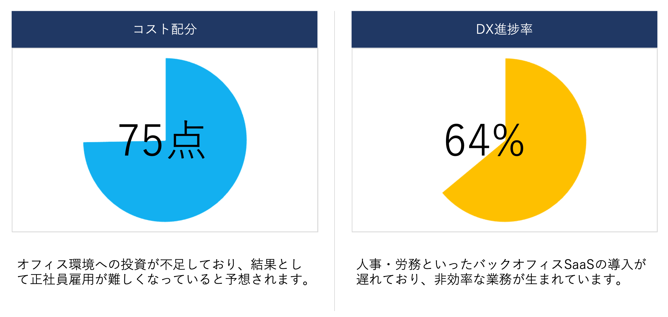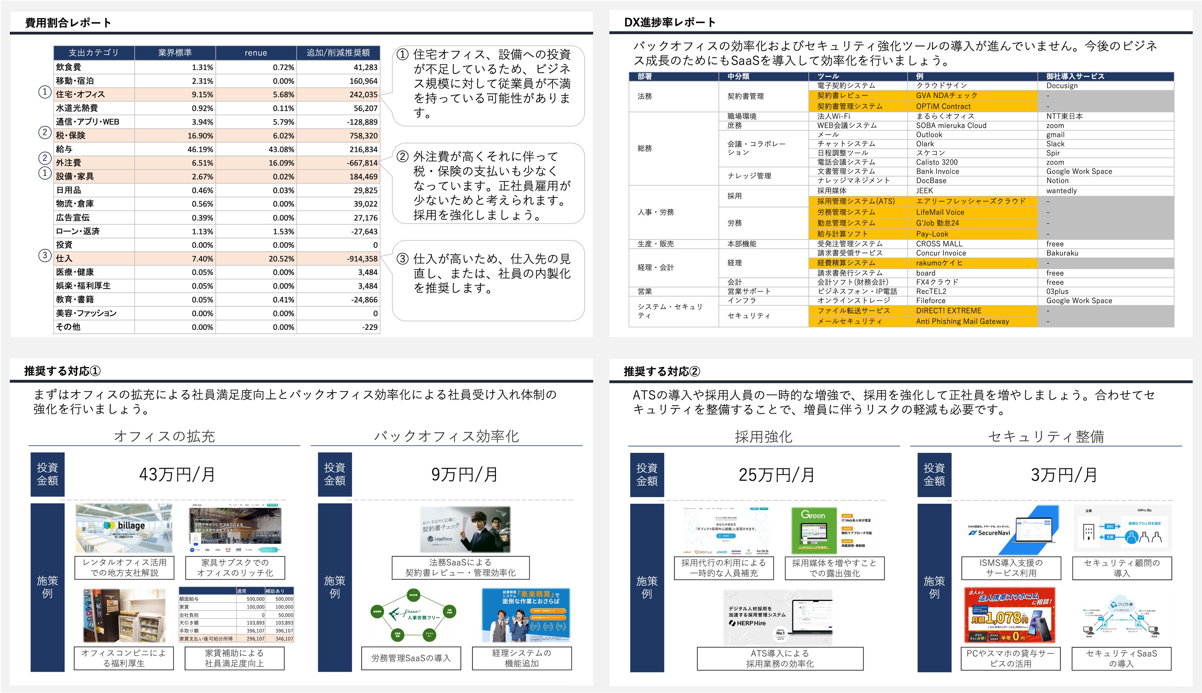 費用割合レポートでは、業界の標準コスト構造に対して自社が「お金をかけすぎている」「投資が足りない」項目を洗い出します。DX進捗率レポートでは、事業規模に応じて導入が推奨される業務領域において適切なDXがされているかを評価します。推奨する対応では、これらの課題抽出から導かれる結論として、削減すべき項目や導入すべきSaaS、実施すべき施策を提示します。