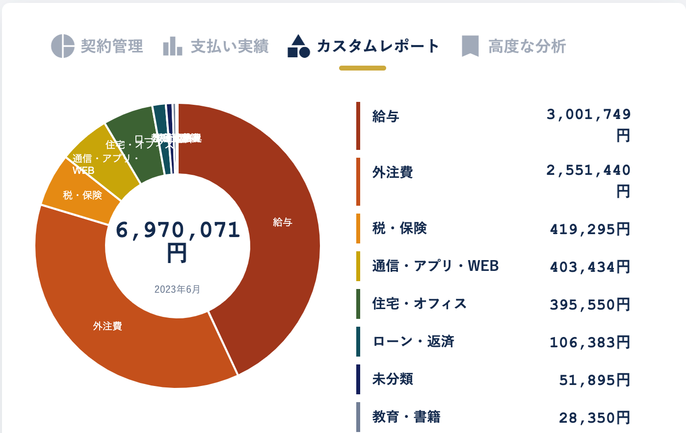 財務・会計データの登録後には、自動で分析が走り、企業が定常的に支払っている契約を抽出してコスト構造を洗い出します。案内に従って各種の登録を行うことで、契約先の管理にもつながります。全ての項目を登録すると、部署・部門別のコスト構造や今月末の出金額予測を見ることができるようになります。キャッシュフロー管理に苦労されている企業様は、これを期に是非ご利用になってください。