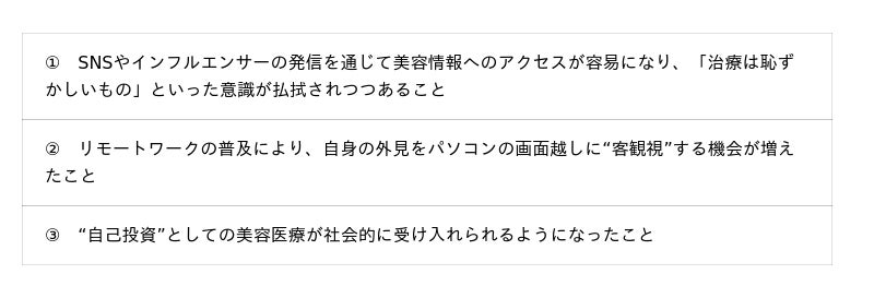 内服薬の有効性は医学論文でも多数報告されていますが、実臨床の場では内服薬治療のみだと患者さまの思い描いている姿まで到達できないことも多いです。注入治療やレーザー治療などクリニックでの施術をご検討される方が多いという状況は、【内服治療では得られなかった治療効果を期待したい】という患者さまの顕在ニーズを反映していると思います。