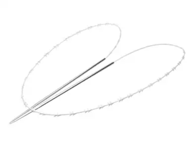 体内でゆっくり吸収されるPCL(ポリカプロラクトン)素材を使用しており、約24カ月かけて分解されるため、効果が持続しやすい点が特徴です。柔軟性のある長い糸(約30cm)を両端の針で挿入し、顎下のラインに沿ってV字状に通すことで、なめらかにデザインできます。特殊なコグ(突起)が皮下組織をしっかりと支える構造により、たるみやもたつきにアプローチし、自然な印象で引き締まったフェイスラインへ導きます。