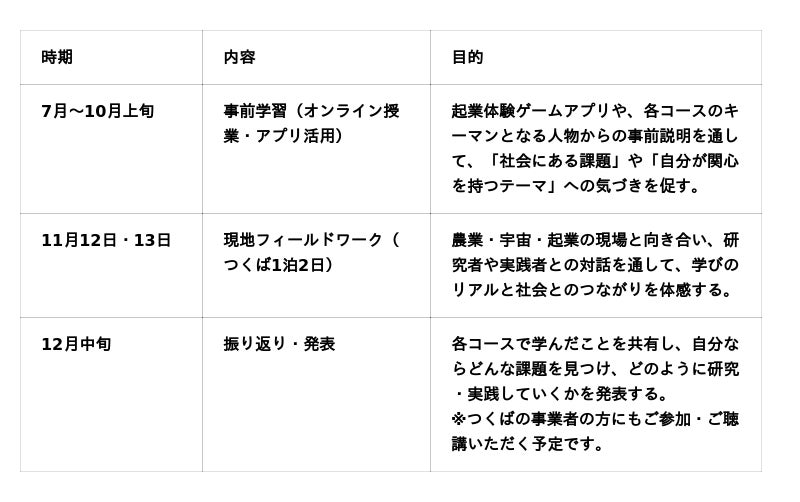 本プログラムは、「学びの先には何があるのか?」をテーマに、茨城県つくば市を舞台に実施。農業などの地域課題を起点に、研究や社会実装のプロセスを学ぶことで、“学びが社会にどう生かされていくのか”を体感する探究の場をつくります。