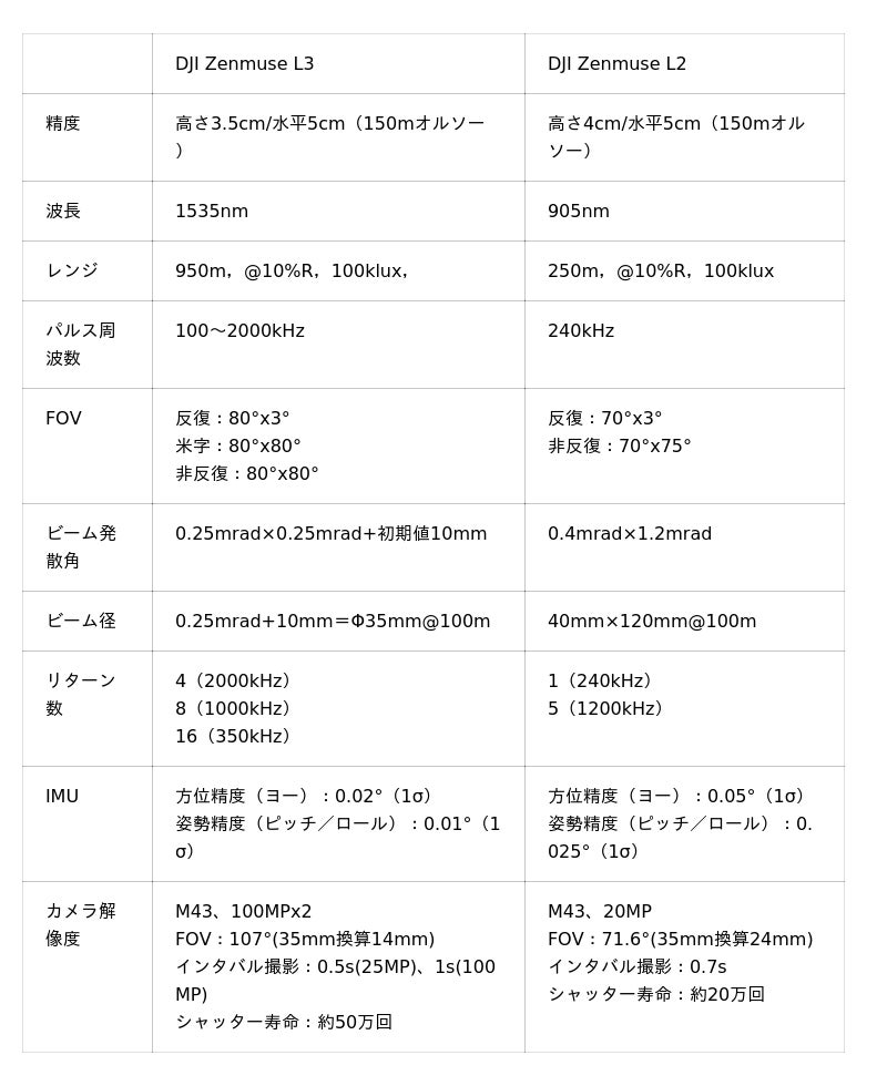 ■「DJI Zenmuse L3」と前モデル「DJI Zenmuse L2」スペック比較