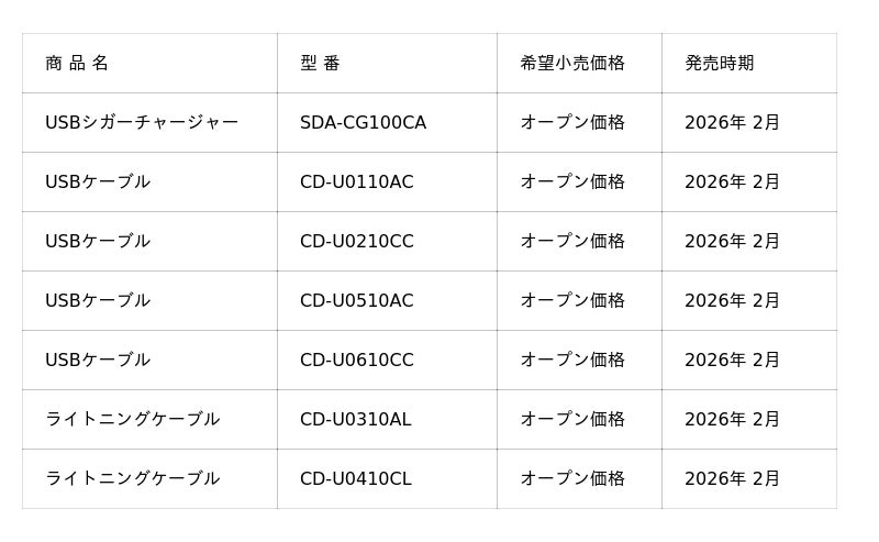 USBシガーチャージャー「SDA-CG100CA」は、USBタイプC(最大出力 30W)とUSBタイプA(最大出力 18W)の2ポートを搭載し、スマートフォンをはじめとした複数のデバイスを同時に充電できます。また、急速充電にも対応しているので、スマートフォンやタブレットの電池残量が少ない場合でも、短時間でしっかりと充電できます。USBケーブルは、磁力で簡単にまとめられるマグネットタイプと断線や折り曲げに強く柔軟性にも優れた高耐久構造タイプを、ライトニングケーブルはマグネットタイプをラインアップしています。