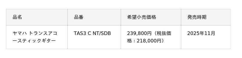 ヤマハ株式会社(以下、当社)は、ギター内部に「アクチュエーター(加振器)」を搭載し、アンプやエフェクターなどの周辺機器を使用せずに生音に豊潤な響きを付加することができるアコースティックギター「トランスアコースティック(TM)ギター」の新製品として、コンサートスタイルの『TAS3 C』を2025年11月に発売します。