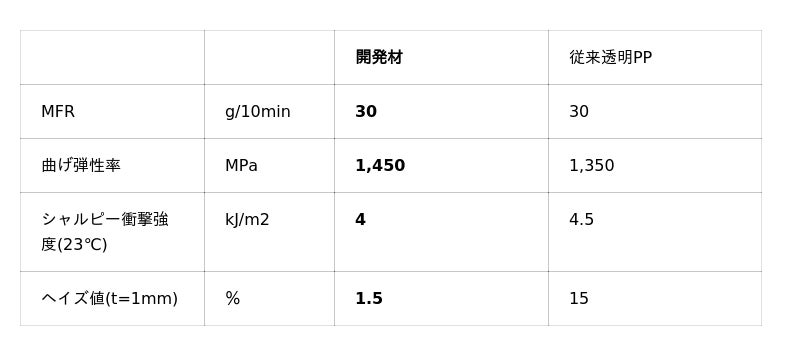 これは、長年培ってきた材料設計技術と、独自のメタロセン触媒技術によって製造されたPP「ウィンテック(TM)」を融合させることで実現したものです。本材料は、ポリスチレン(PS)やポリエチレンテレフタレート(PET)などの透明樹脂の代替材料として、軽量化と環境負荷低減に貢献する次世代素材として期待されます。