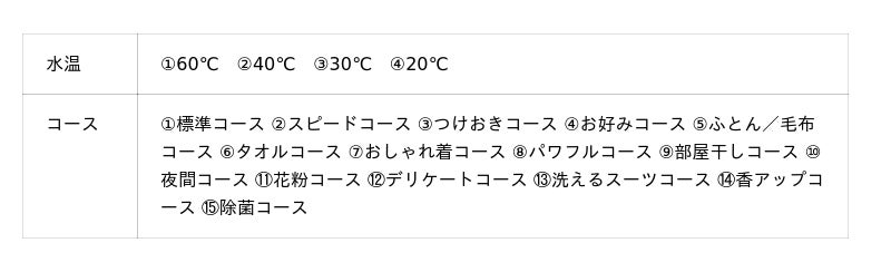 ※洗濯コース以外にも洗濯槽お手入れ(槽洗浄2分・4時間・12時間/カビ防止槽乾燥 1時間)コースもあります。