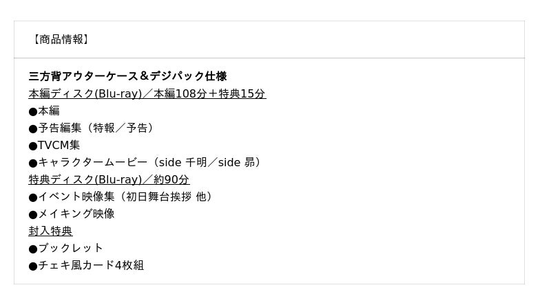 豪華版に封入される特典ディスクには、映画公開を記念した数々のイベントの模様が収録されます。七夕当日にキャストと松本監督がそれぞれ浴衣で登壇した完成報告会見をはじめ、福本さんと八木さんが客席に交じり観客にシークレットで本編を鑑賞し、作中に登場する懐中電灯を使用した演出とともに客席から登場して、会場を騒然とさせた公開御礼舞台挨拶までイベント映像がたっぷり収録されます !